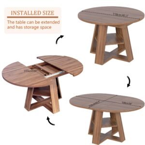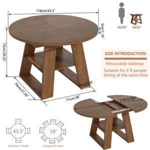YOSIMFUR 43.3in-59in Extendable Round Dining Table for 4-8,Modern Kitchen Oval Dining Table with Removable Leaves Space Saving,Wood Base with Storage Shelf for Kitchen Living Room (Walnut)