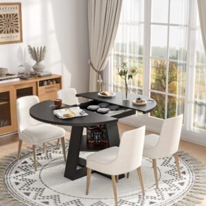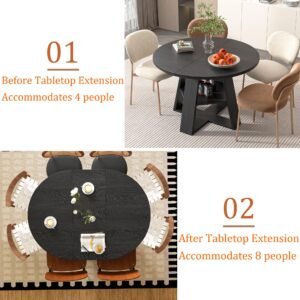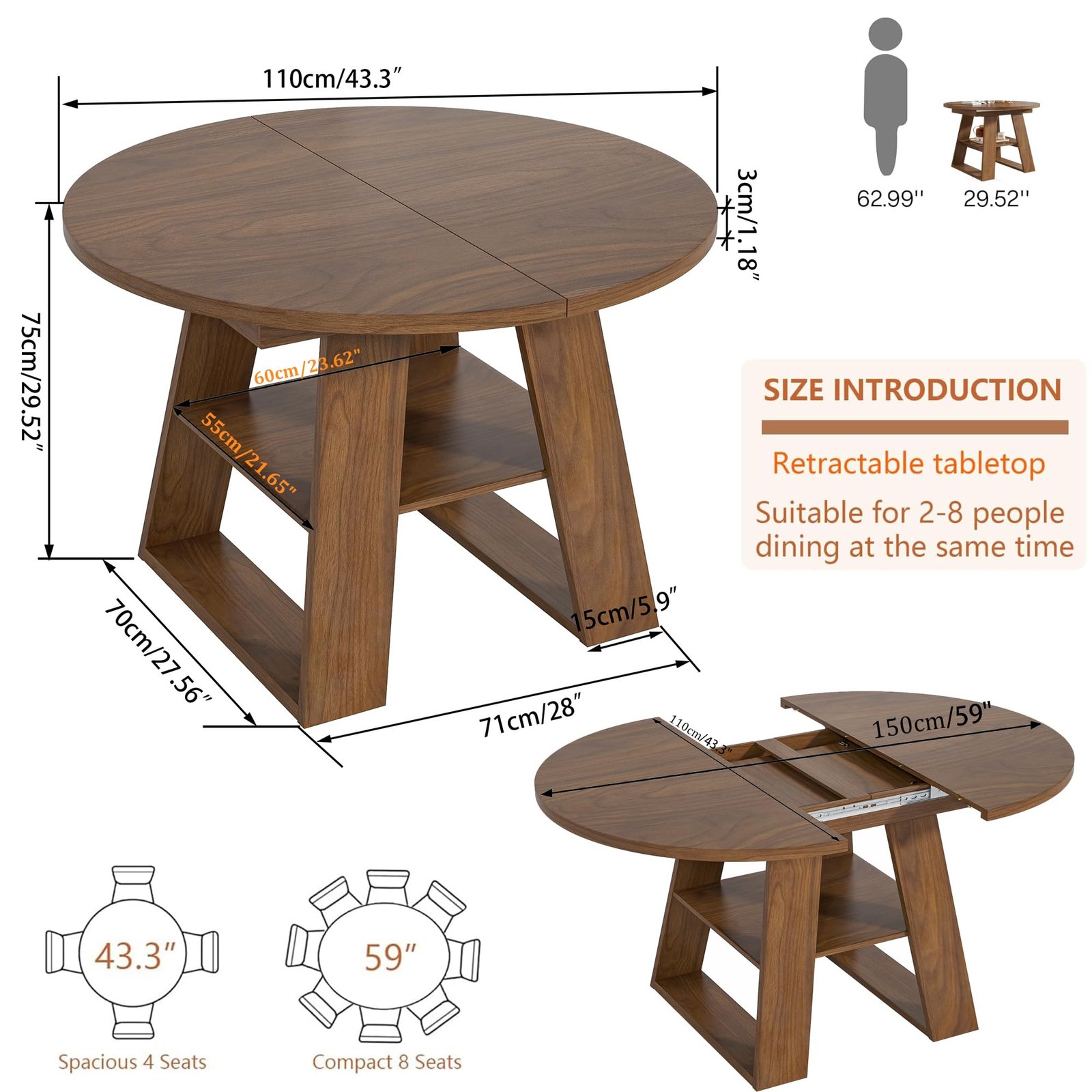 · Retractable dining table for 4-8 people: Considering the use in different scenarios, the dining table adopts a retractable design and a smooth and silent rail. By assembling independent extension leaves in the middle of the dining table, it can be quickly and easily expanded from the original 43.3” round dining table to a 59” L x 43.3” W oval dining table. The extension leaves can be stored under the tabletop, making your space more flexible