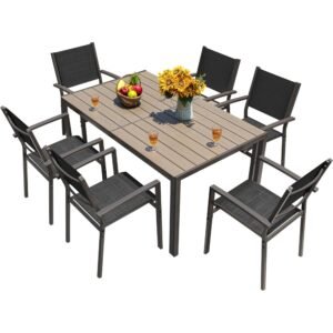 YOSIMFUR Dining Set 7 Pieces Outdoor Furniture with Large Table and 6 Textilene Chairs for Porch, Poolside, Yard and Garden, Light Grey