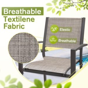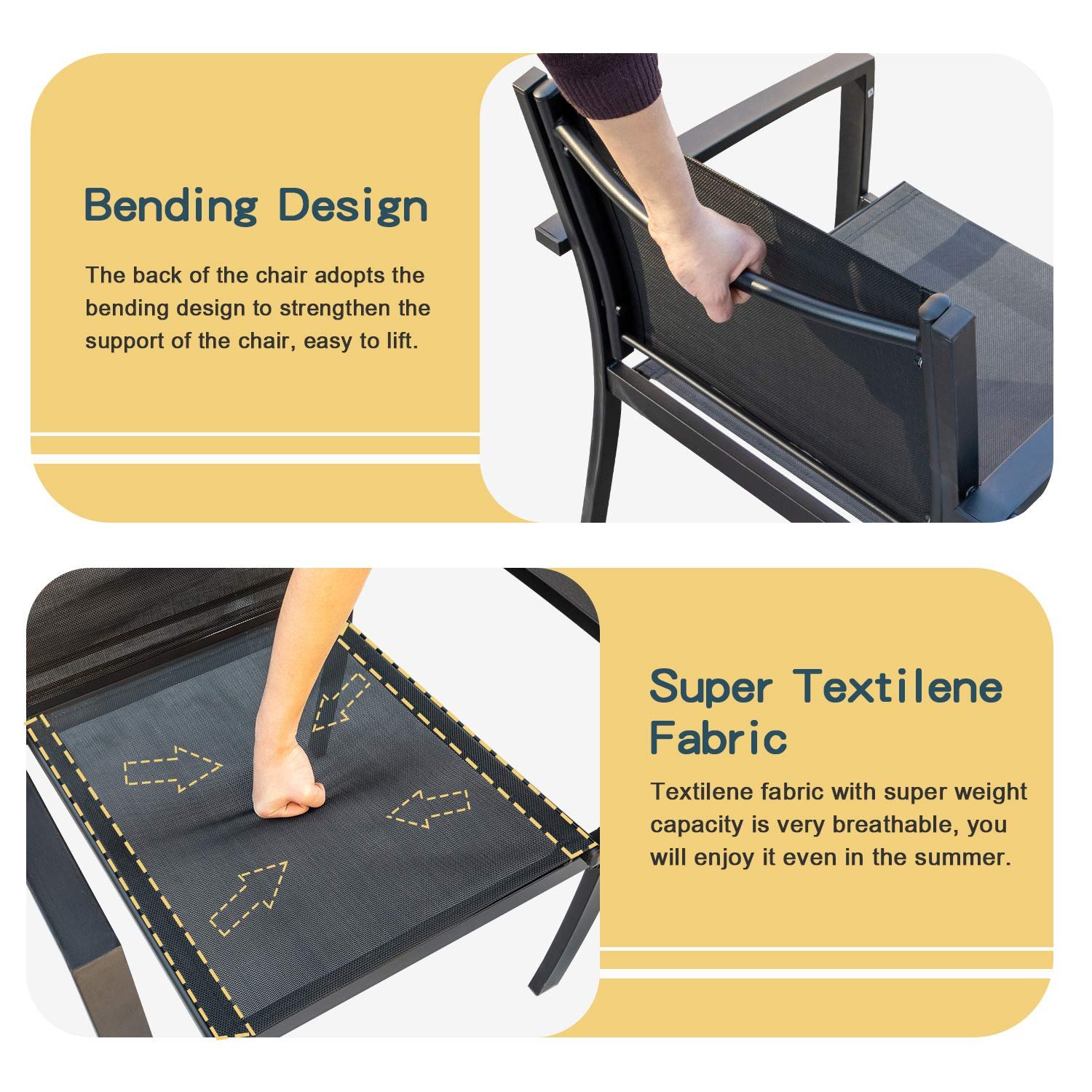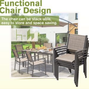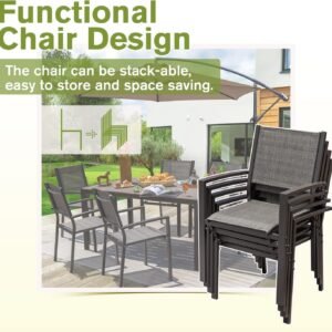 · Stackable Chairs: The patio table and chairs includes six chairs and a table, so you don’t have to worry about not having enough chairs. It is ideal for dining with family and gathering with friends. The six chairs are stackable, which saves a lot of storage space and makes it easy to carry