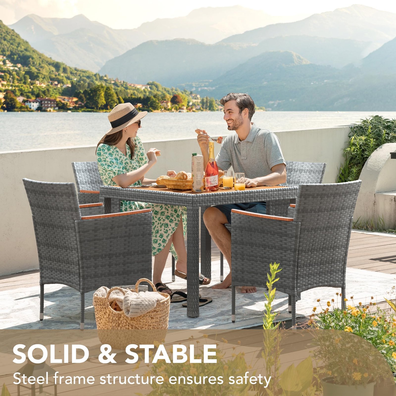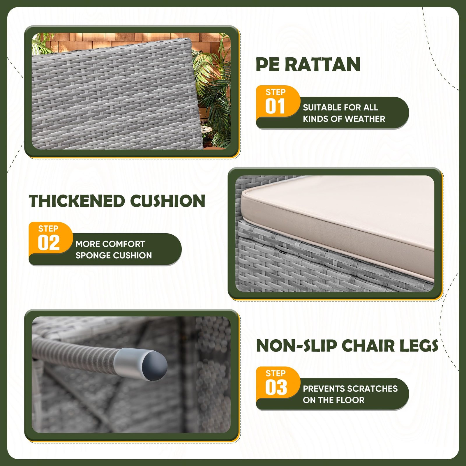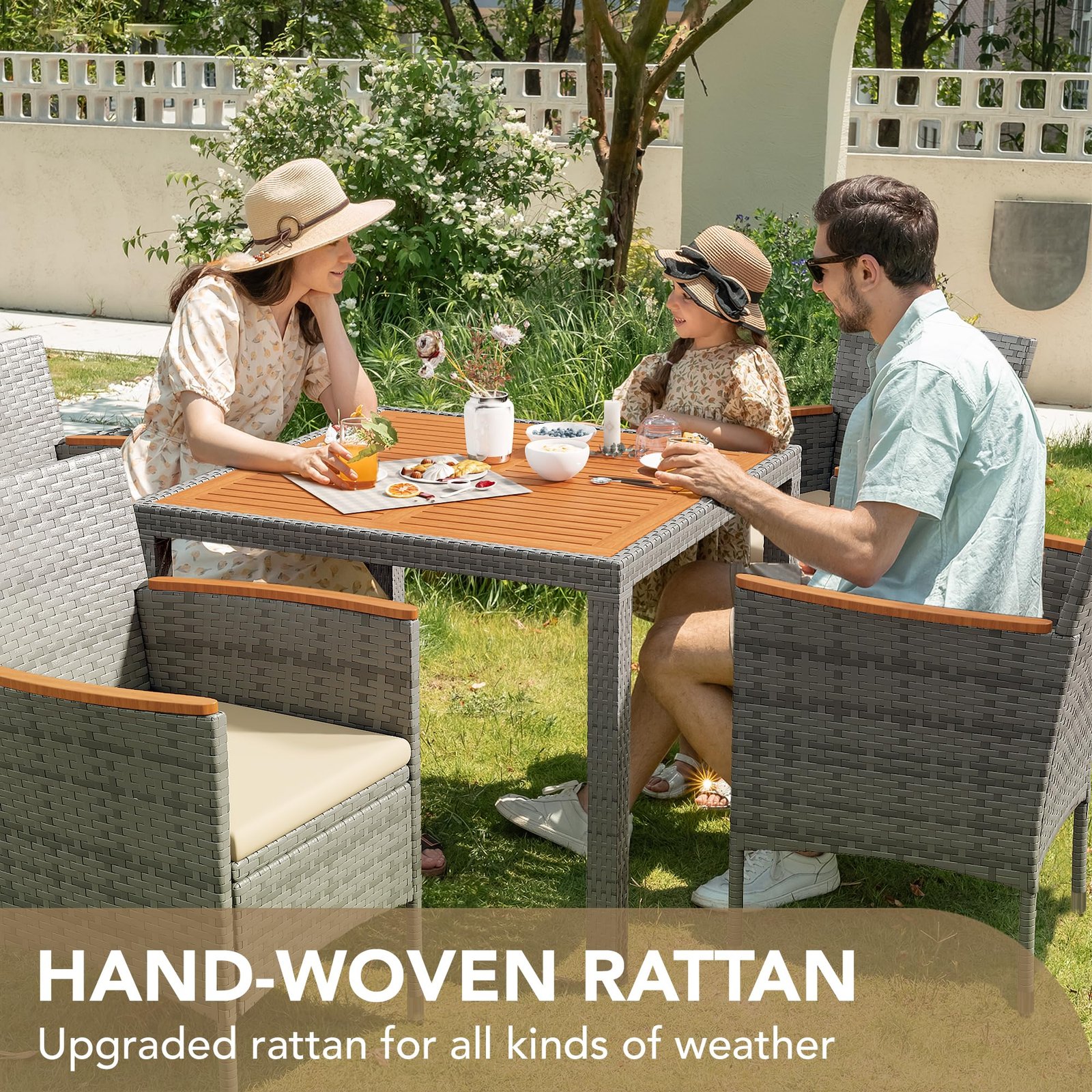 · Hand-woven rattan: The upgraded stronger and more sturdy rattan raw materials are processed into beautiful and delicate rattan, which is hand-woven into comfortable and perfect dining tables and chairs by experienced craftsmen. It also has good weather resistance