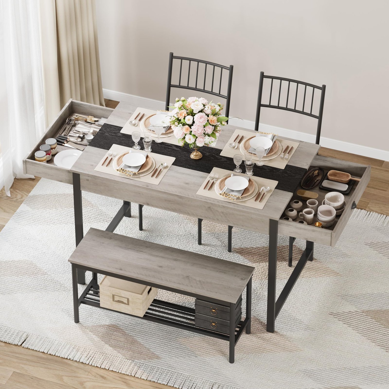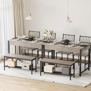 The accompanying benches and chairs are designed with a streamlined profile, allowing them to tuck neatly beneath the table when not in use. This smart space-saving design creates an unobstructed area for effortless movement, maintaining both functionality and aesthetic appeal.
